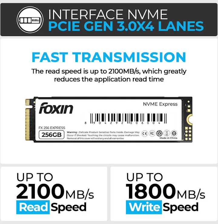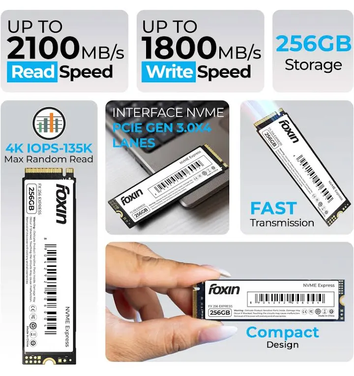 Upgrade your storage with the Foxin 256GB NVME SSD and experience ultra-responsive performance with read speeds up to 2100MB/sec and write speeds up to 1800MB/sec. Equipped with a Micron chipset and SMI controller, this SSD offers reliable and durable storage for faster data access. Ideal for laptops and PCs, it enhances overall system performance.