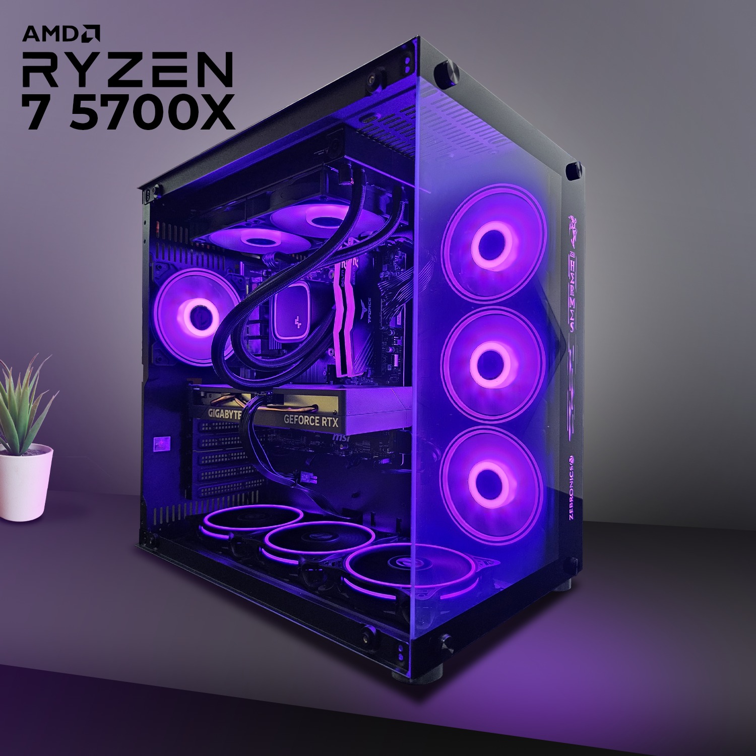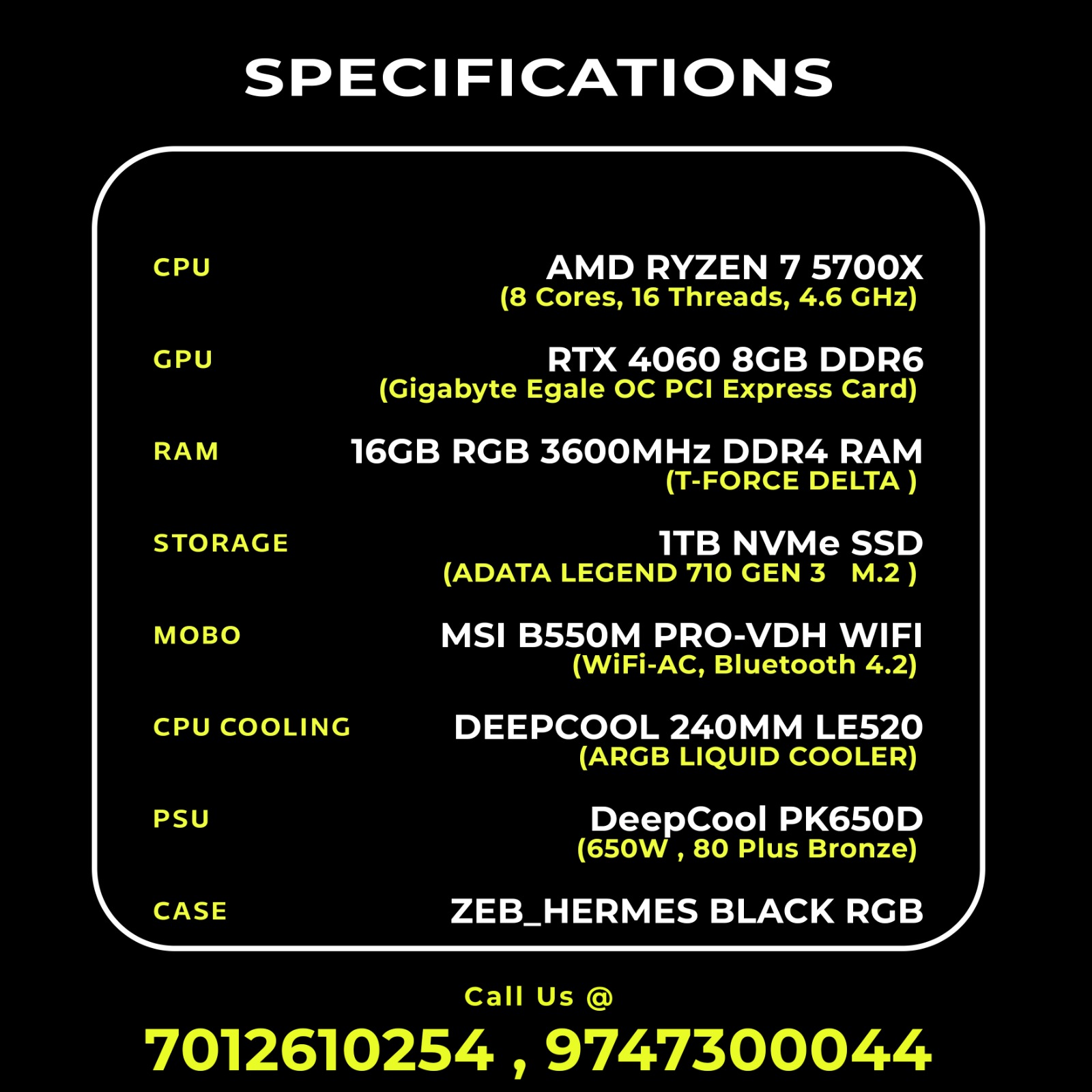 Our PC build boasts the AMD Ryzen 7 5700X processor and MSI B550M Pro-VDH WiFi motherboard for unparalleled speed and efficiency. Keep your system cool with the Deepcool 240mm LE520 ARGB liquid cooler and add a touch of style with T-Force Delta 16GB DDR4 RGB RAM. Swiftly load games and applications with the Adata Legend 710 Gen 3 1TB M.2 NVMe SSD, while the Gigabyte RTX 4060 8GB DDR6 Eagle OC GPU delivers breathtaking graphics.Powering it all is the reliable Deepcool 650W PK650D SMPS.