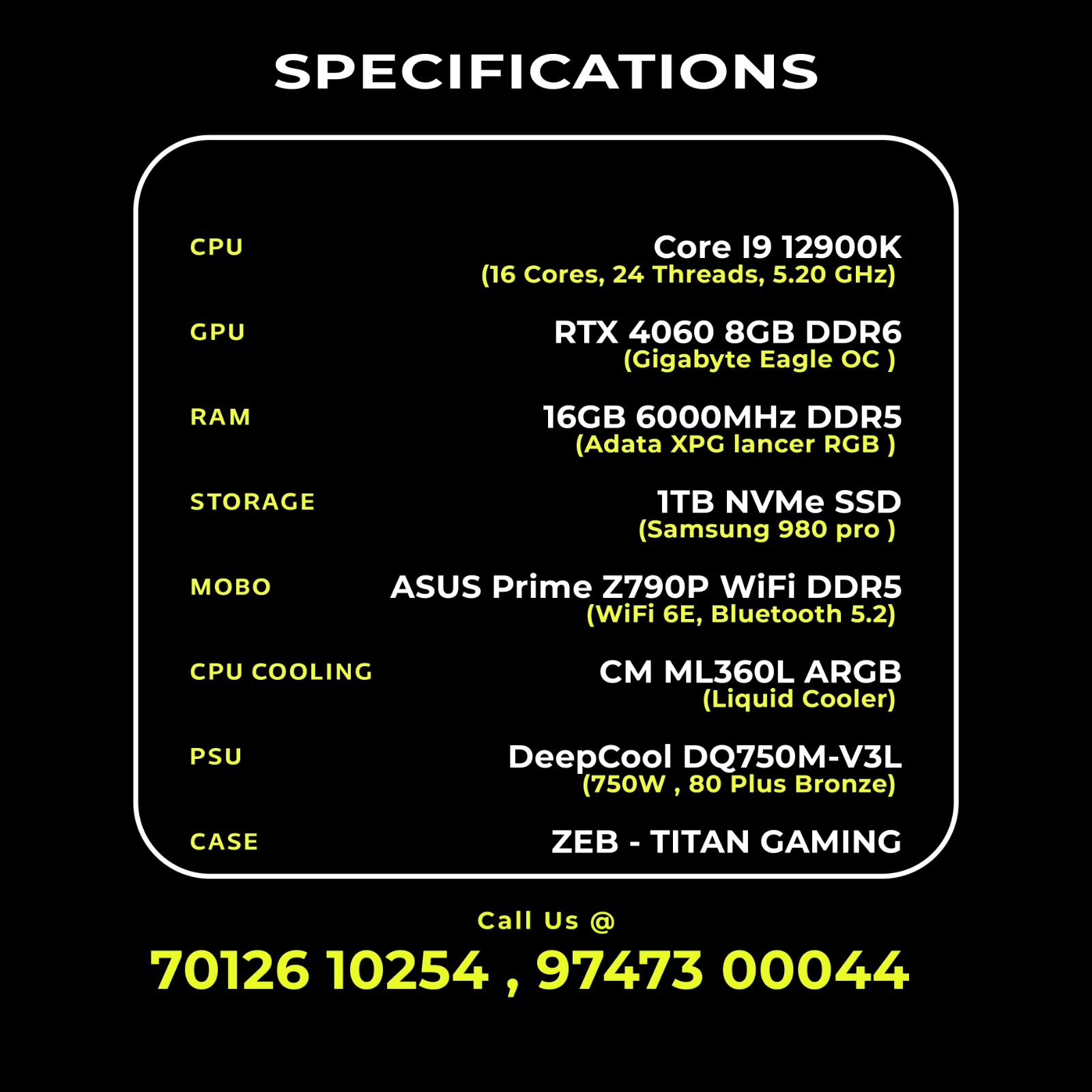 This high-end system features an Intel Core i9 12900K processor paired with an ASUS Prime Z790P WiFi motherboard for exceptional performance and connectivity. It includes 16GB of ADATA XPG Lancer DDR5 RAM clocked at 6000MHz for rapid multitasking and a 1TB Samsung 980 Pro NVMe SSD for fast storage. The Gigabyte RTX 4060 8GB DDR6 Eagle OC graphics card ensures outstanding gaming visuals. Cooling is managed by a Cooler Master ML360L ARGB liquid cooler, and reliable power is supplied by a Deepcool DQ750M-V3L Gold certified PSU. All components are housed in a stylish Zeb Titan gaming cabinet, providing a powerful and efficient computing experience.
