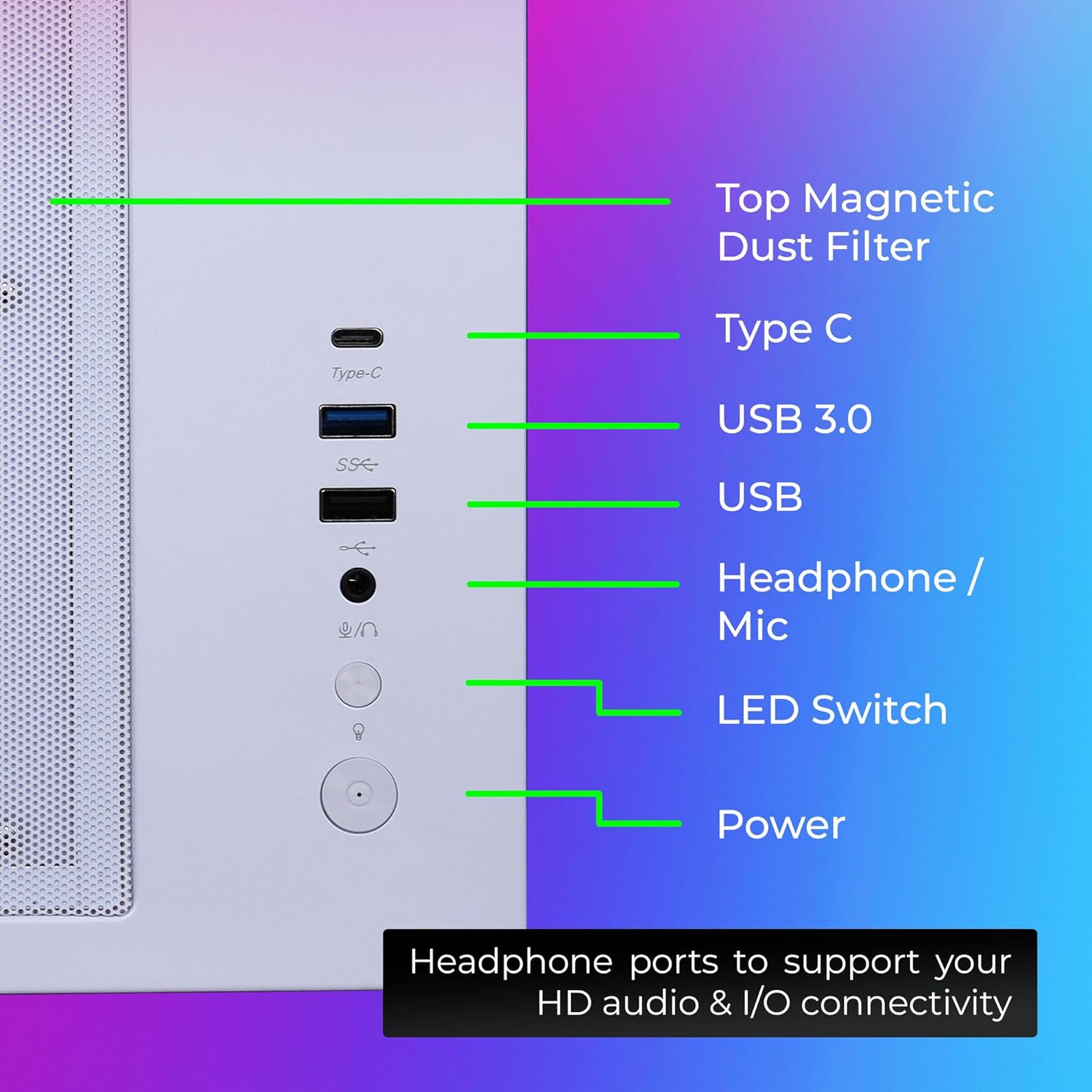 - For audio and other device connectivity, the chassis comes with one USB 3.0 port, USB port, type-C port,a 3.5mm mic, and headphone port. You can now insert add-on cards at the back panel of the chassis in its 7 expansion slots.